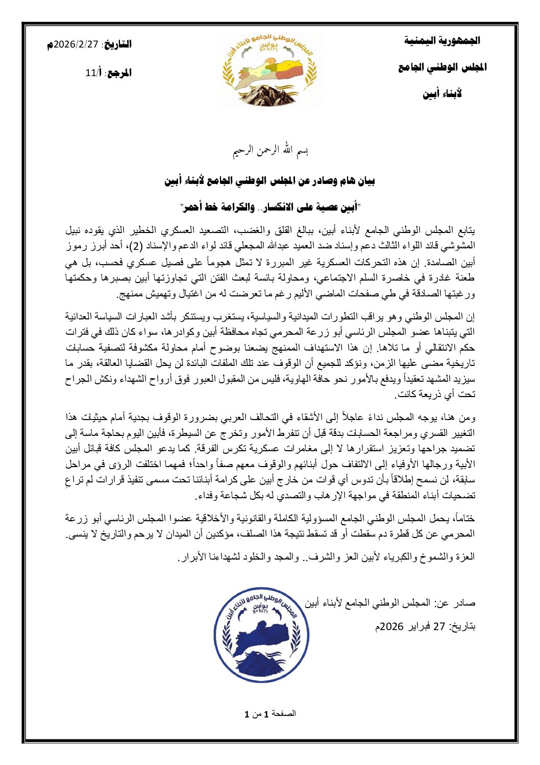 خاص – حضرموت نيوز يتابع المجلس الوطني الجامع لأبناء أبين، ببالغ القلق والغضب، التصعيد العسكري الخطير الذي يقوده نبيل المشوشي…