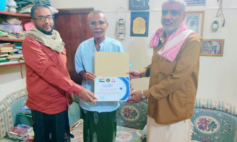 وسلّم الشهادة الأستاذ علي قاسم بن طالب رئيس الهيئة التنفيذية للمجلس الانتقالي بالمديرية، إلى جانب الأستاذ عبدالمعز سالم محيسون مدير إدارة الفكر والإرشاد، بحضور عدد من قيادات المجلس.