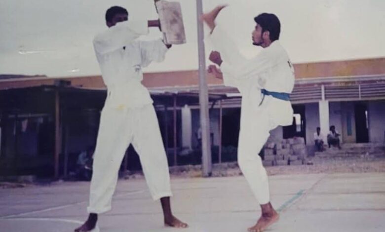 * الصورة للكابتن لطفي بن الشيخ أبوبكر أثناء تدريبه أحد طلاب كلية التربية بساحة الكلية بمدينة المكلا.