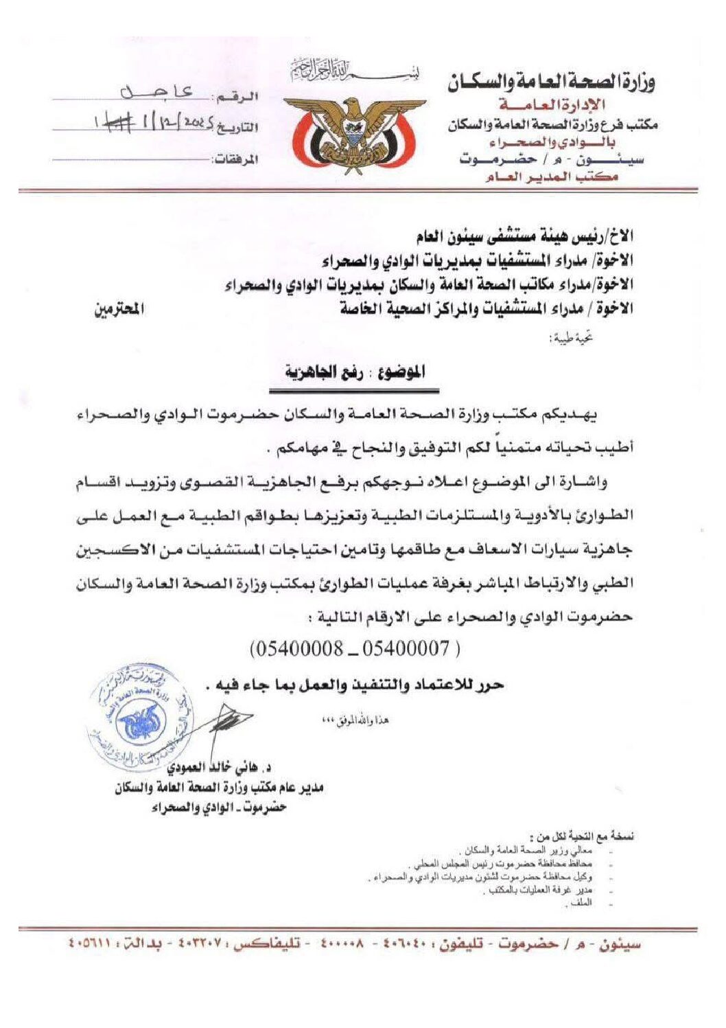أصدر مكتب وزارة الصحة العامة والسكان بحضرموت الوادي والصحراء، توجيهاته لكافة المستشفيات والأقسام الطبية بضرورة رفع الجاهزية القصوى للطوارئ، وتزويد أقسام الطوارئ بالأدوية والمستلزمات الطبية اللازمة، وتعزيزها بالكوادر الطبية المؤهلة.