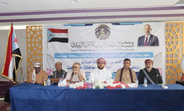 انتقالي حضرموت يعقد اجتماعاً موسعاً لهيئات المجلس بالمحافظة.. ويؤكدون على أن محاولة تمزيق النسيج الجنوبي وتفريخ المكونات لن تنجح