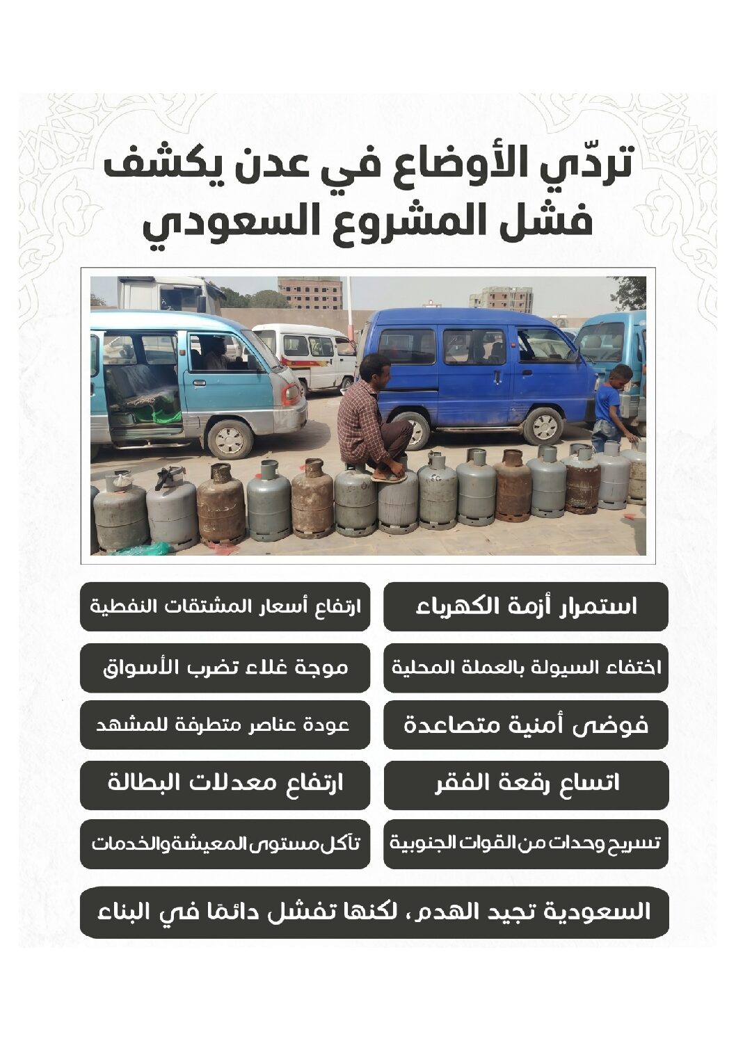 تشهد العاصمة المؤقتة عدن تدهورًا متسارعًا في مختلف الأوضاع المعيشية والخدمية، في ظل استمرار الأزمات المزمنة وتفاقم التحديات الاقتصادية، ما يضع السكان أمام واقع يومي بالغ الصعوبة، تتداخل فيه أزمات الكهرباء، وارتفاع أسعار المشتقات النفطية، وانعدام السيولة النقدية.