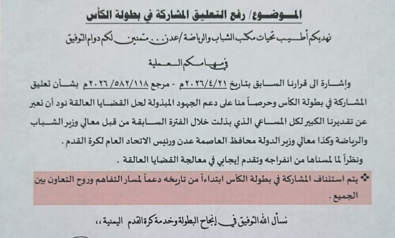 وجاء القرار بعد سلسلة من الاجتماعات والتواصل مع الجهات المعنية، بما يضمن عودة أندية عدن للمنافسات الرسمية ويسهم في إنجاح البطولة.