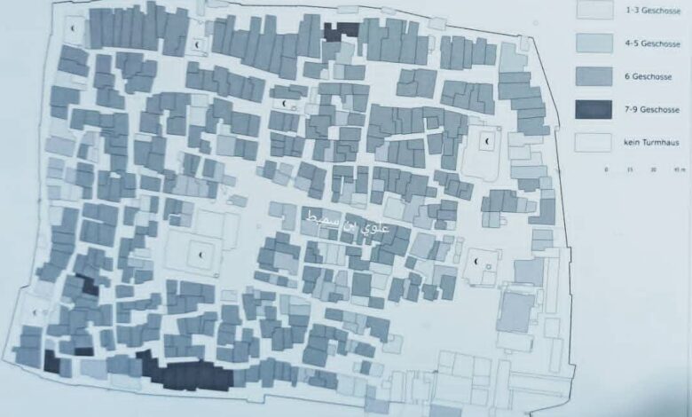 وتكشف الخرائط المعمارية الخاصة بالمدينة عن توزيع دقيق للمنازل ومستويات ارتفاعاتها، مع تحديد واضح لعدد طوابق كل منزل وفق مفتاح هندسي يُظهر التدرج الرأسي للبناء داخل المدينة التاريخية.