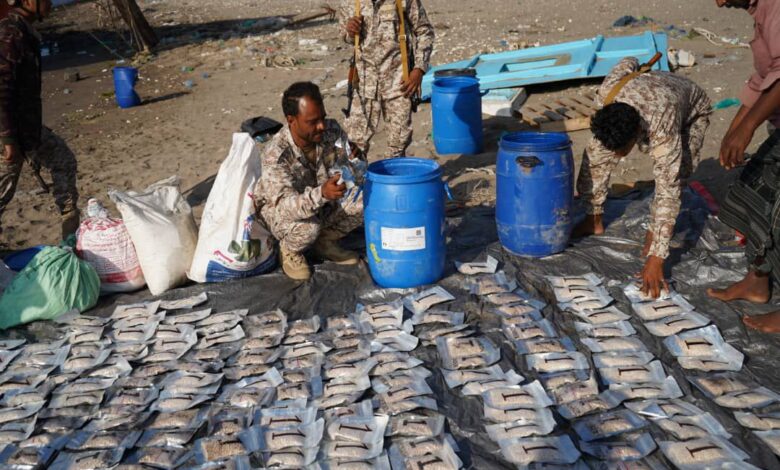 الحملة الأمنية لقوات العمالقة الجنوبية تضبط كمية كبيرة من المخدرات على متن قارب بالقرب من باب المندب