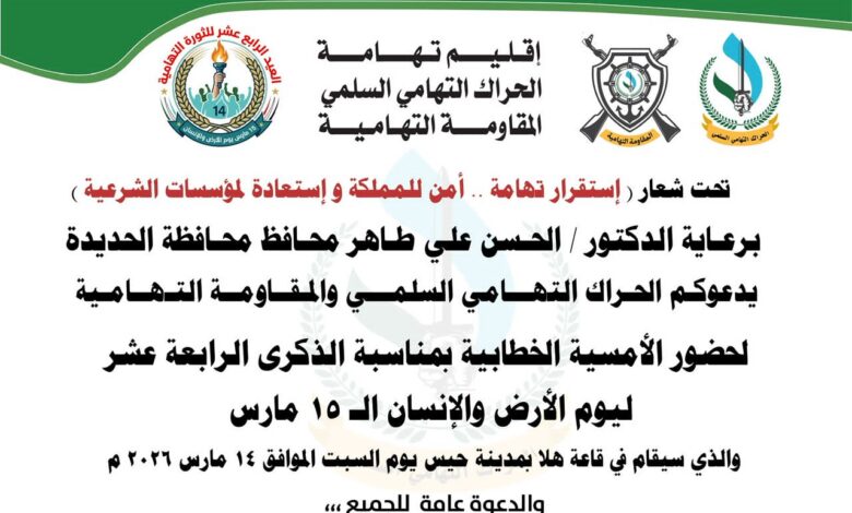 ومن المقرر أن تقام الأمسية الخطابية مساء يوم غدآالسبت الموافق 14 مارس 2026م، عند الساعة التاسعة مساءً، في قاعة هلا بمدينة حيس، حيث ستتضمن كلمات لعدد من القيادات والشخصيات الوطنية التي ستتناول دلالات يوم الأرض والإنسان التهامي وأهميته في مسيرة النضال التهامي.